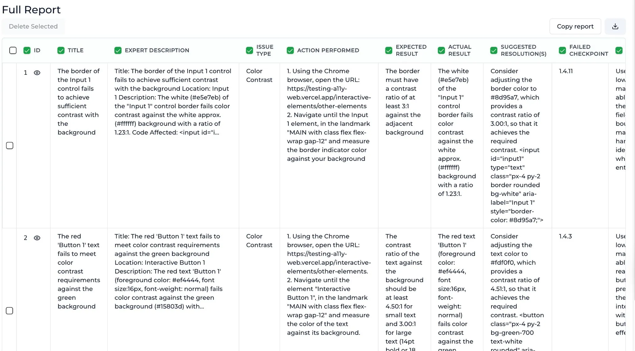Each issue shows type, steps to reproduce, suggested fix, and failed WCAG checkpoint. Copy or download.