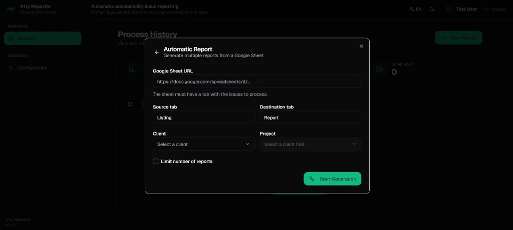 Generate multiple reports from a Google Sheet. Configure source/destination tabs, client and project, and optional limits.