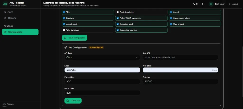 Define report fields (title, severity, WCAG checkpoint, etc.) and integrate with Jira for ticket creation.