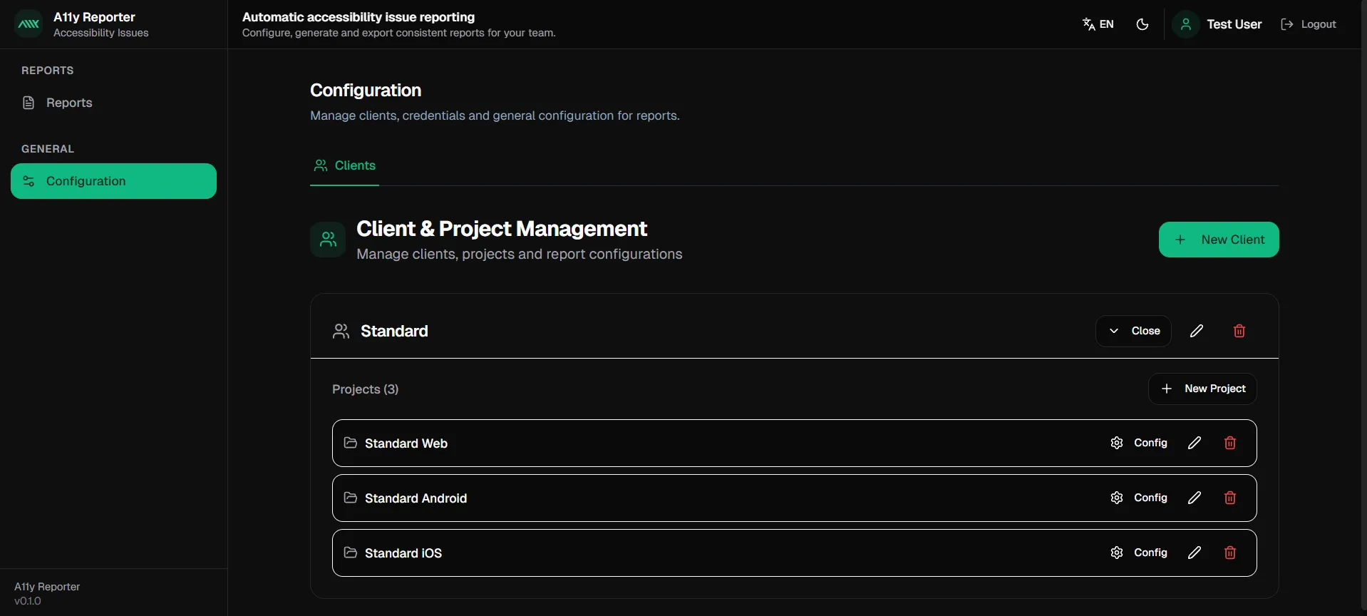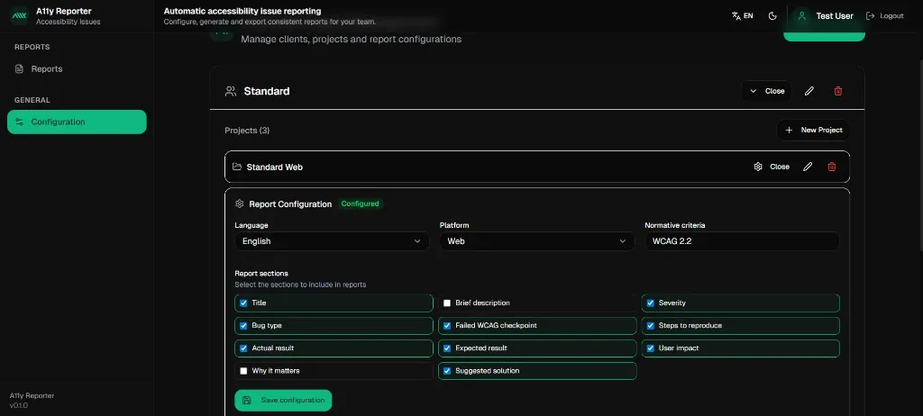 Manage clients, projects and report configurations. Set language, platform (Web, iOS, Android) and normative criteria.