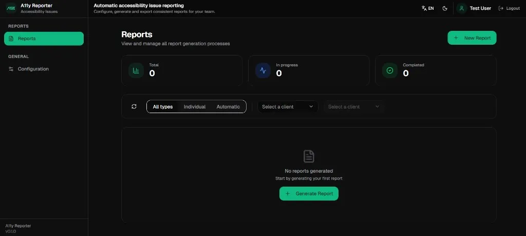Overview of report statistics, filtering by type (All, Individual, Automatic), and quick action to generate your first report.